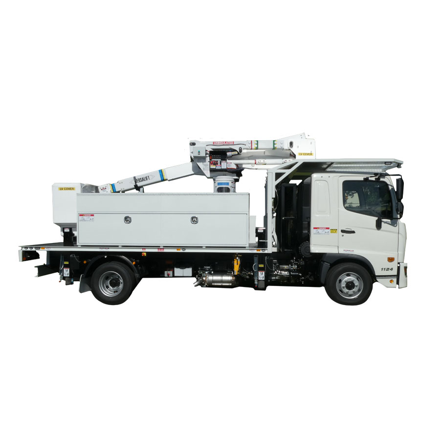 Its side-by-side boom stow design allows for safer operator entry to the platform, together with a reduced travel height. The configuration is particularly suited to tower combo units, where aerial platform and work and tool storage bins are fitted into one versatile working machine.